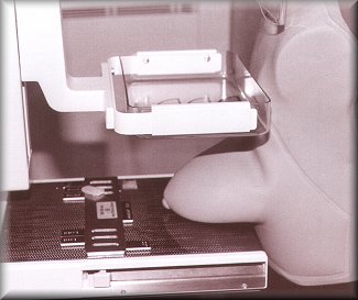 expertise. A molded gel provides realistic compressibility. Mammograms are taken at a breast thickness of 5-cm, using normal technical factors. The breast is mounted on a post with adjustments for height and the angles needed for various views. A small indicator box is placed next to the breast to signal when the 5-cm breast thickness is reached. An "ouch" is represented by a red warning light which informs the trainee that a patient's pain level can be reached at about this compression. The light is actuated 5-mms before the dead stop produced by the box. This procedure emphasizes the care needed for patients when the pain zone is reached. | ![]() |